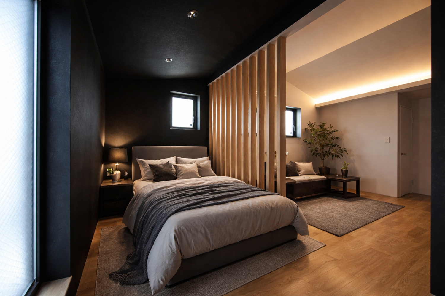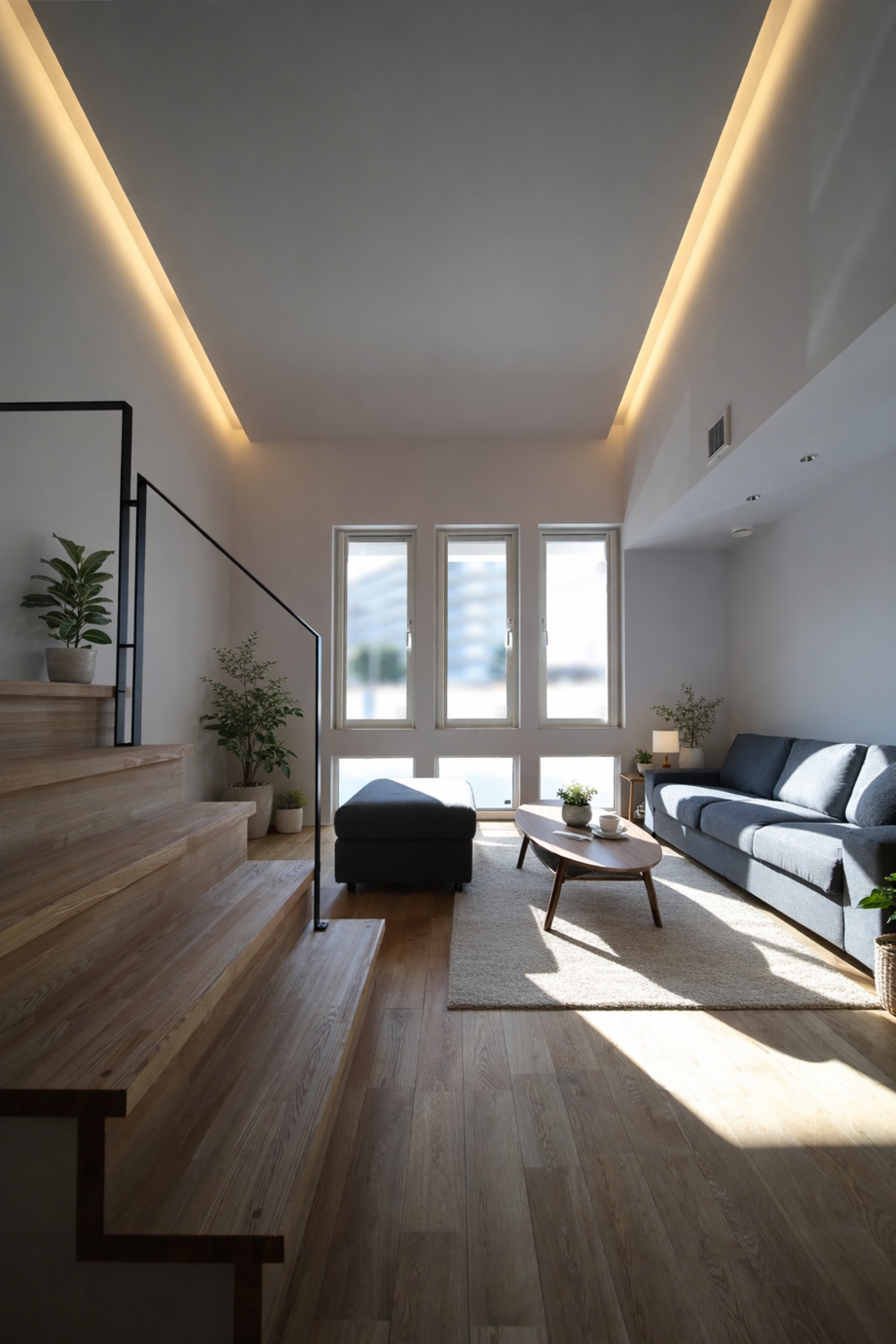 代わりに間接照明を多用することで、空間全体を柔らかく温かみのある光で包み込みます。