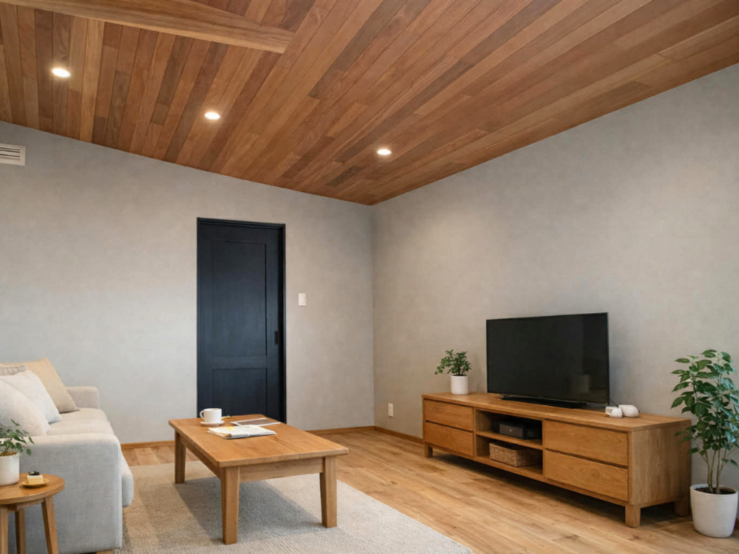 無垢材で仕上げましたデザインウォールは、テレビが壁掛けできるように仕上げました。