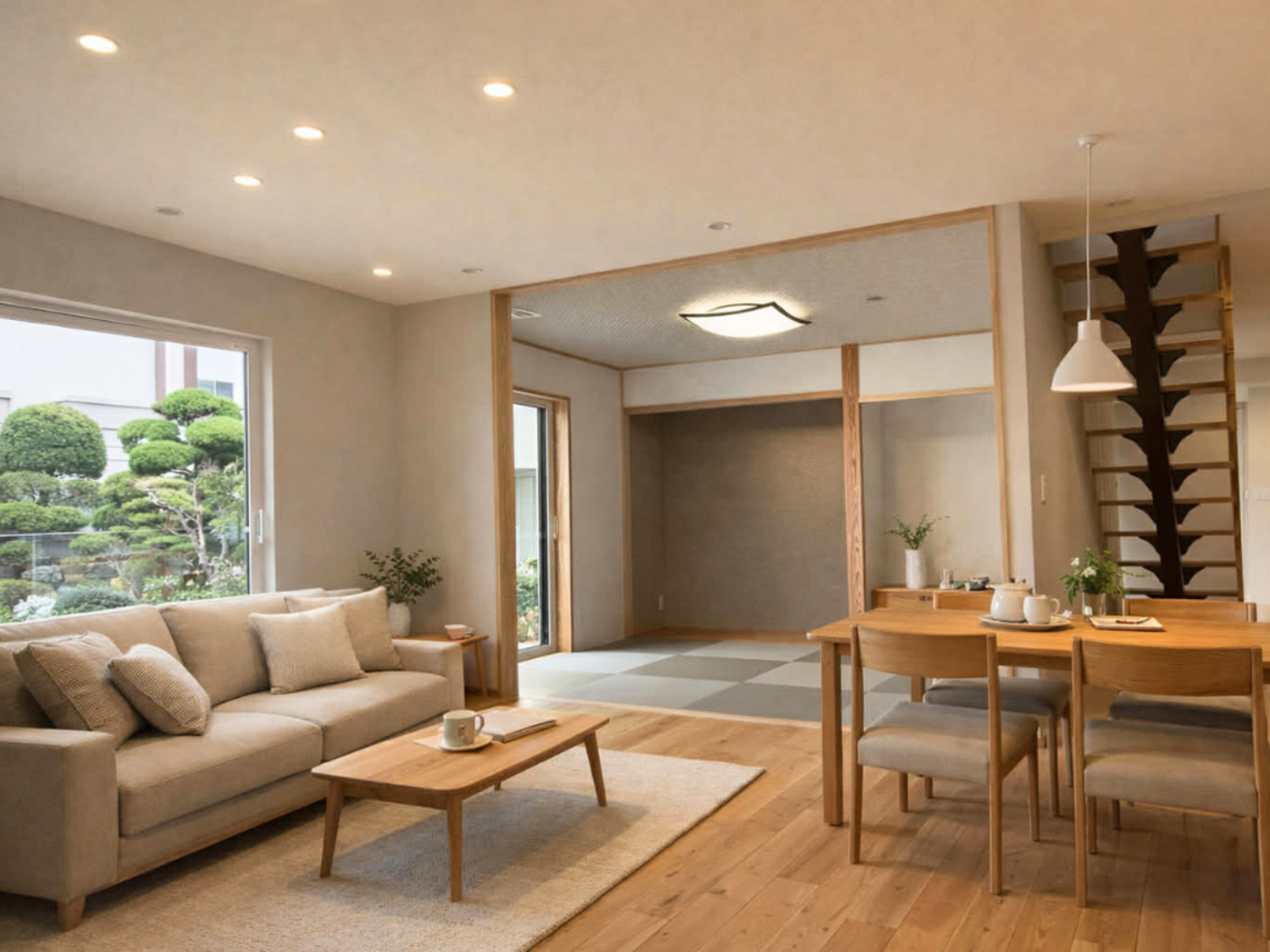 玄関からすぐに、開放的なリビングダイニングと和室。